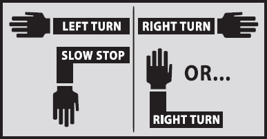 - 使用所示的手势信号进行转弯、变道和停车。骑自行车的人可以通过将右手向右伸直来表示右转。