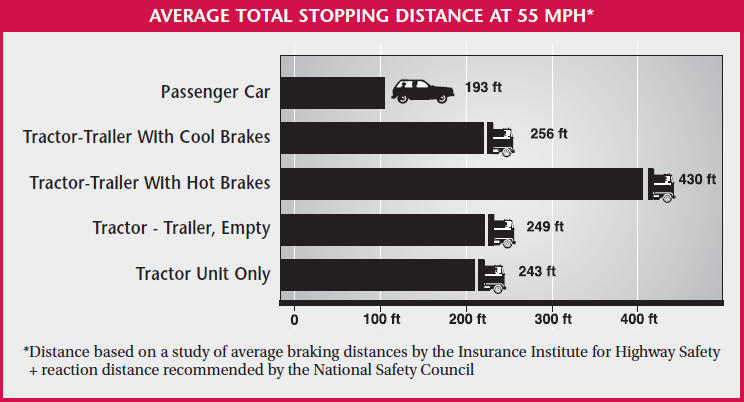 大型车辆比以同样速度行驶的小型车辆需要更长的停车距离。对于拖车,这种差异来自刹车延迟。气制动器将制动力从拖车前部传递到拖车后部,这可能会增加许多英尺的停车距离。在您的汽车和卡车之间留出足够的空间。如果你在卡车前面,及早示意你的转向或变道意图。不要突然改变方向。